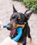Snorkl is intended for dogs who love bones, boomerangs, and tug-of-war. Snorkl's fun shape is designed for interactive and bond-forming tug play - makes it perfect for high energy dogs and great for human and dog play or dog and dog play. Snorkl showcases an ocean-inspired swirl texture and floats in water.